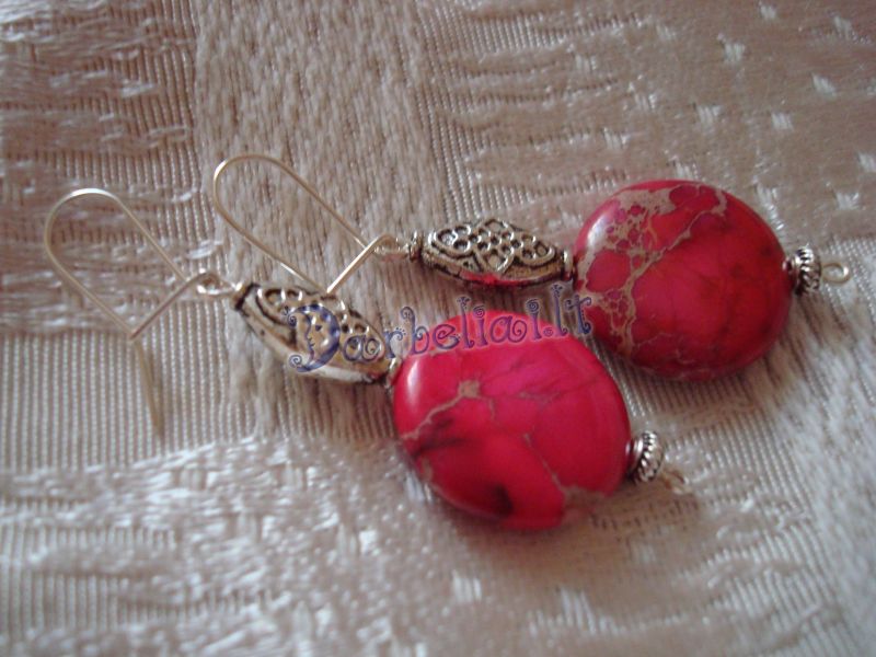 Fuksijų spalvos apskritimo formos akmenėliai. Įvėrimas sidabrinis. Šį sezona madinga spalva ;)